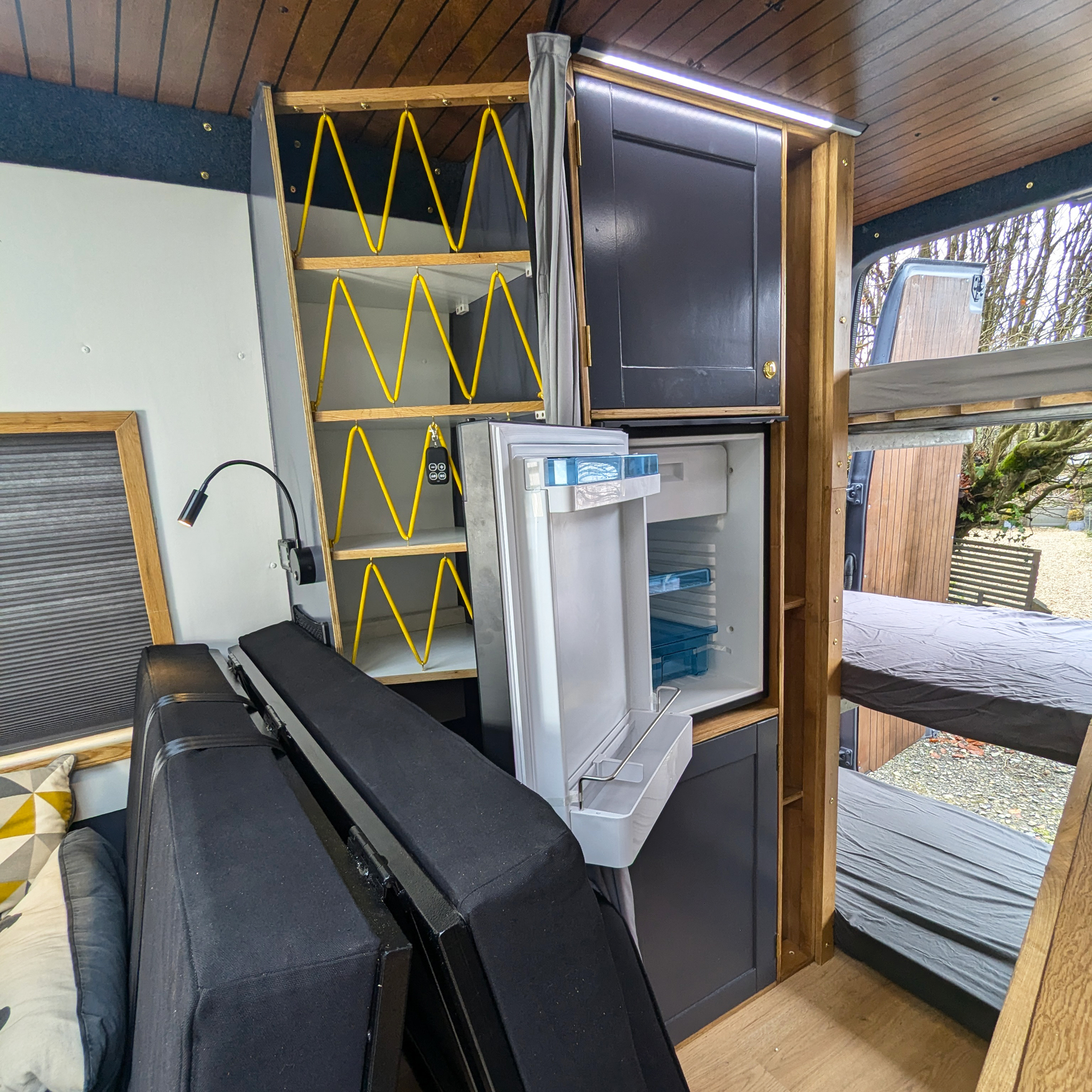 From the front there is: Double passenger and drivers seat with M1 crash tested swivel bases. behind this is the belted M1 crash tested rock ‘n’ roll adults bed, When front seats are swivelled and rock ‘n’ roll bed is in the seat position this creates the lounge and dining area with table for 5. Behind the r’n’r bed is the kitchen which comprises of large 85 L compressor fridge, 3 burner hob, sink. Toilet cupboard with privacy curtain. At the back of the van is the 3 bunks which are adjustable in height, all with lights, usb and storage.